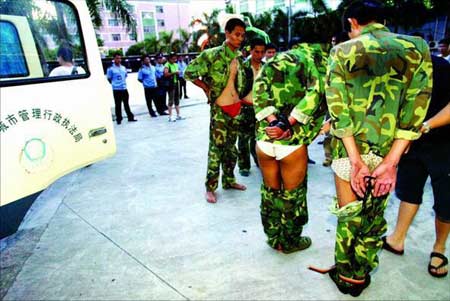 据介绍,这6人开一辆执法车从坂田执法完毕后,又直接到龙华街道办清查路边乱摆卖。下午3时30分许,走到龙华广场一加油站门口附近时,突然被三辆龙华街道的执法车卡死。两名市城管执法队人员当场亮出执法证,对方称他们假冒执法人员。可是,对方身穿的城管制服,却没有编号。随后,又有两三辆车开到现场,言语不和之间,二三十人开始对他们拳打脚踢。不久,6人被扒掉裤子送到派出所,有的人手机被砸,一时无法与市城管部门领导联系。