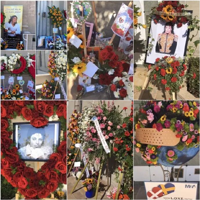 我们中国歌迷共同捐赠的鲜花,也已在当天送到MJ的墓前。我们的花和全世界歌迷的花放在一起,蔚为壮观: